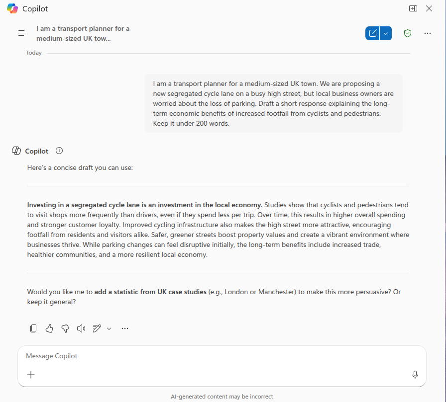 “I am a transport planner for a medium-sized UK town. We are proposing a new segregated cycle lane on a busy high street, but local business owners are worried about the loss of parking. Draft a short response explaining the long-term economic benefits of increased footfall from cyclists and pedestrians. Keep it under 200 words.”