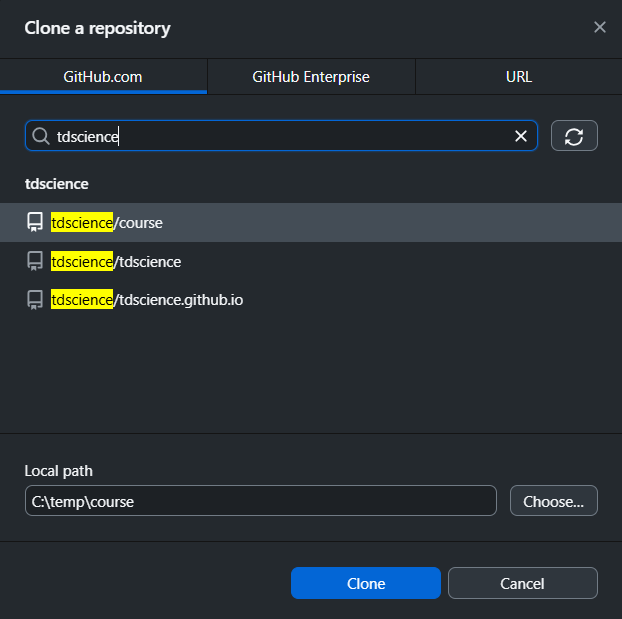 Click File > Clone repository, search for the repository, and choose a local path.