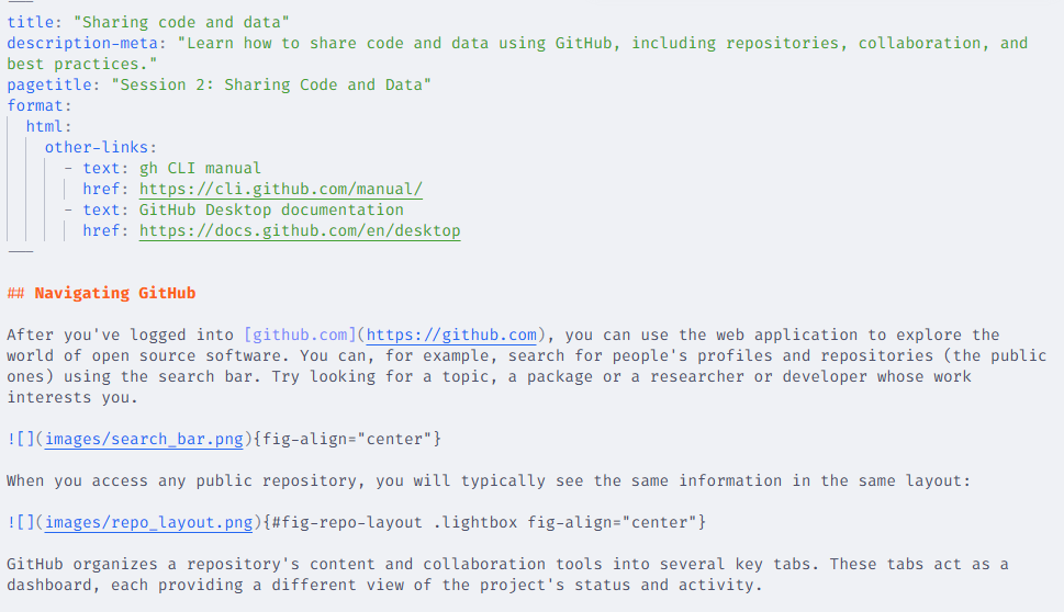 Quarto documents are authored in a plain text format, using a markup language called Markdown. A markup language is a system for annotating a document using a set of tags or symbols to define the structure, formatting, and other properties of the text within a digital document. You might be familiar with commonly used markup languages like HTML or LaTeX. These languages make the text readable by both humans and machines. Since Quarto documents are based on plain text files, you can use Git and GitHub for version control.