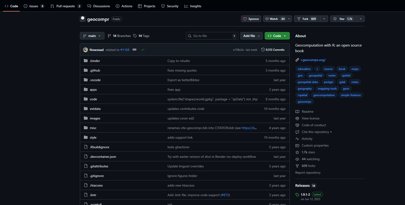 Once your repository is created, you should be able to see it online. To access it, click on the Repositories tab in your profile page and select the repository you just created. You can see a list of repositories in your profile page by clicking on the Repositories tab, or typing github.com/username?tab=repositories in your browser, replacing username with your GitHub username. To see robinlovelace’s repositories, for example, you can type the following into your browser: github.com/Robinlovelace?tab=repositories.