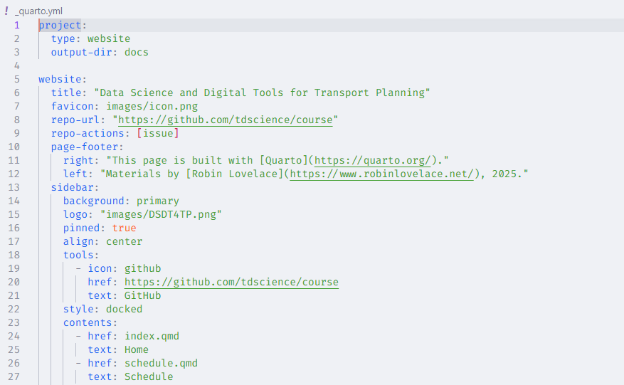 _quarto.yml): It’s a YAML (YAML Ain’t Markup Language) configuration file that lives in the project’s root directory. It defines global settings for all the documents in the project, such as the project type, metadata, output directories, and project-wide configuration for execution, style, and format. The contents of this file will depend on the type of project you are working on. Here is a sneak peek of the project file for this website: