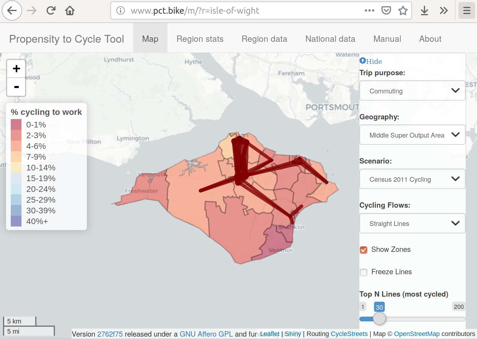 There was a reason for selecting the top 30 lines: it mirrors the view of the desire lines available from the PCT web application for the island, available at www.pct.bike/m/?r=isle-of-wight (note that Straight Lines is selected from the Cycling Flows dropdown menu in the image below, and by default shows the top 30 flows by number of bicycle trips).