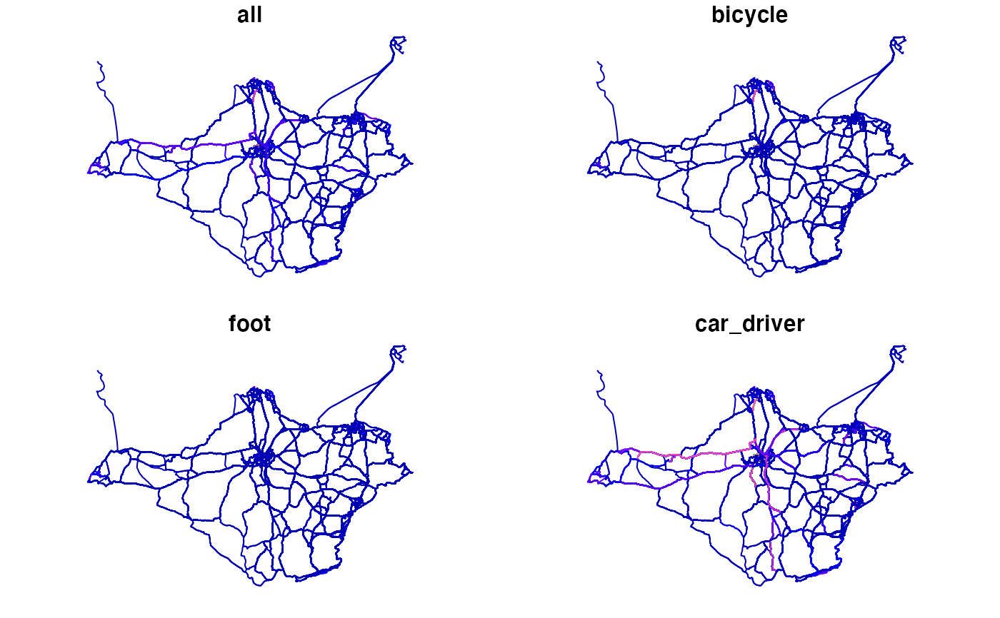 #> [1] "id" "geo_code1" "geo_code2" "geo_name1" #> [5] "geo_name2" "lad11cd1" "lad11cd2" "lad_name1" #> [9] "lad_name2" "all" "bicycle" "foot" #> [13] "car_driver" "car_passenger" "motorbike" "train_tube" #> [17] "bus" "taxi_other" "govtarget_slc" "govtarget_sic"z = get_pct(region = "isle-of-wight", layer = "z") rf = get_pct(region = "west-yorkshire", layer = "rf") z_all = get_pct(layer = "z", national = TRUE)#> Warning: GDAL Message 1: +init=epsg:XXXX syntax is deprecated. It might return a CRS with a non-EPSG compliant axis order.# }